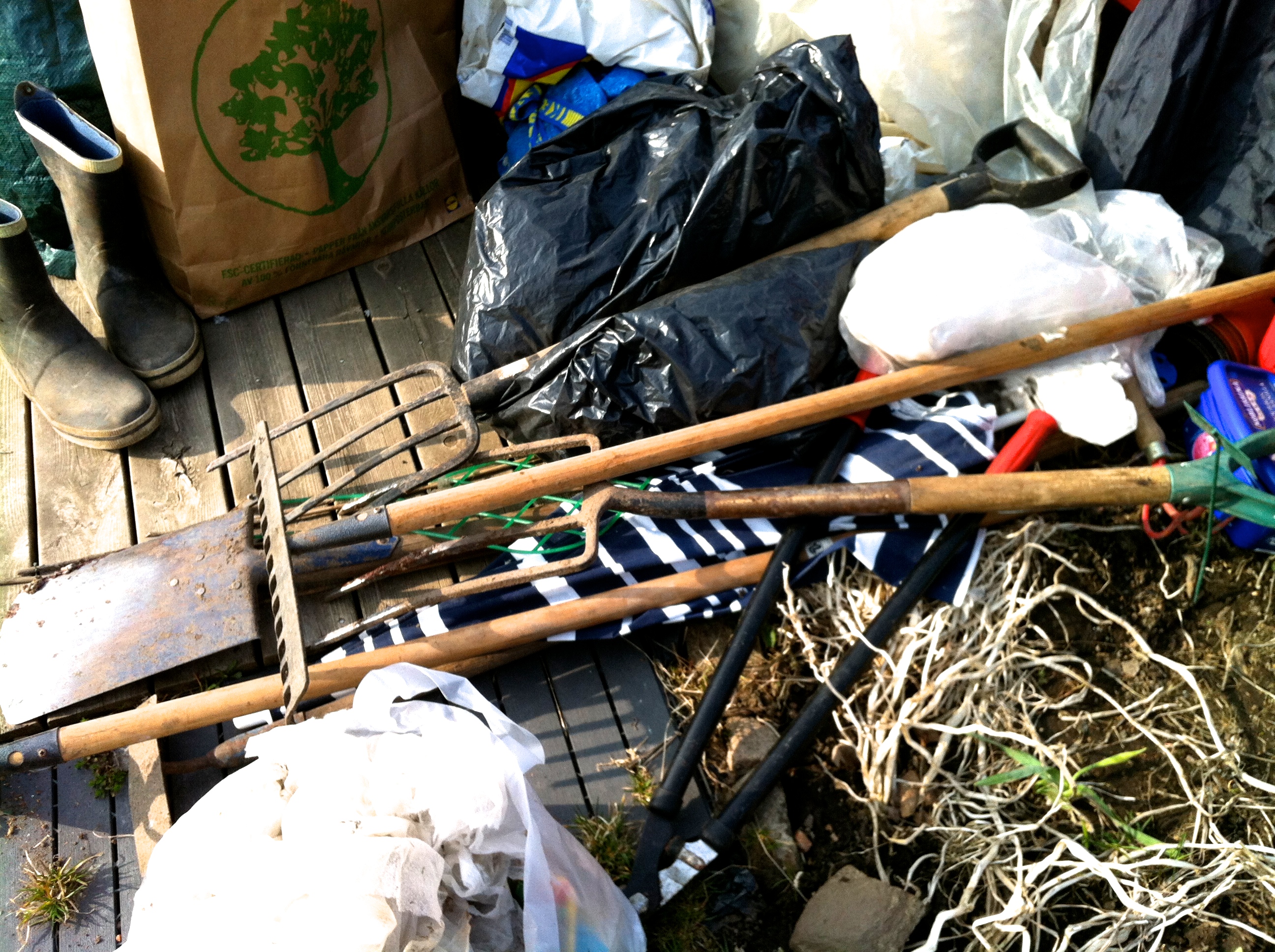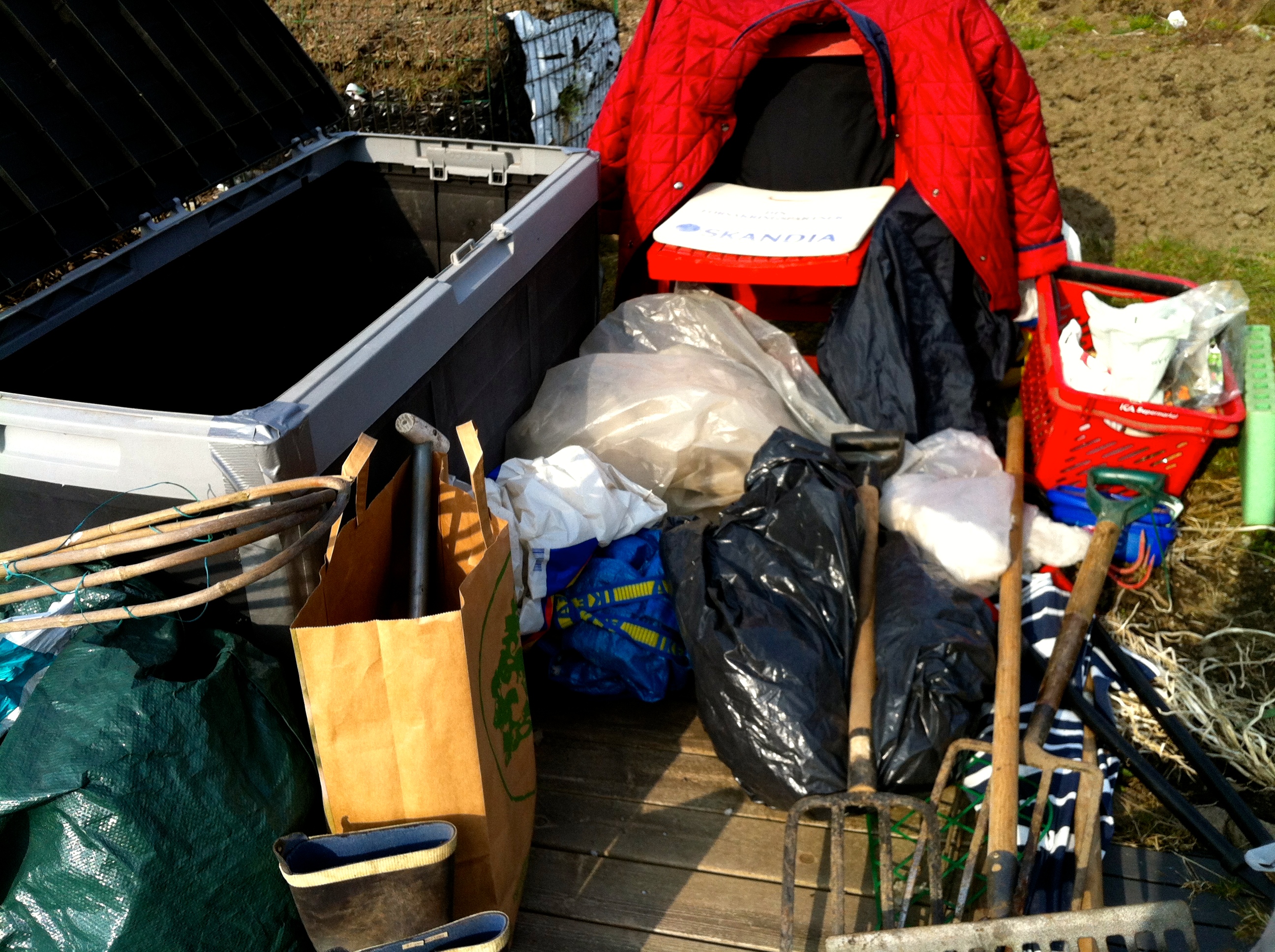 Igår i det sköna vädret åkte jag till min odling. Trodde jag skulle kunna påbörja vårarbetet, men det blev inte riktigt som jag tänkt mig. Öppnade lådan och vad fick jag se – en påse hönsgödsel hade stora hål och det mesta av innehållet var utspritt bland grepar, spadar, krattor och annat. Antagligen besök av möss för även fröpåsarna var det hål i och innehållet borta. Fick röja ut alla grejer och försöka skyffla upp hönsgödseln i ett par andra påsar. Upptäckte när jag tömt lådan ett hål i nederkanten på baksidan, där jag antar att mössen lyckats gnaga sig in. Lådan är av plast, s k dynlåda, vilket väl antagligen är en ”baggis” för en mus att gnaga sig igenom.
