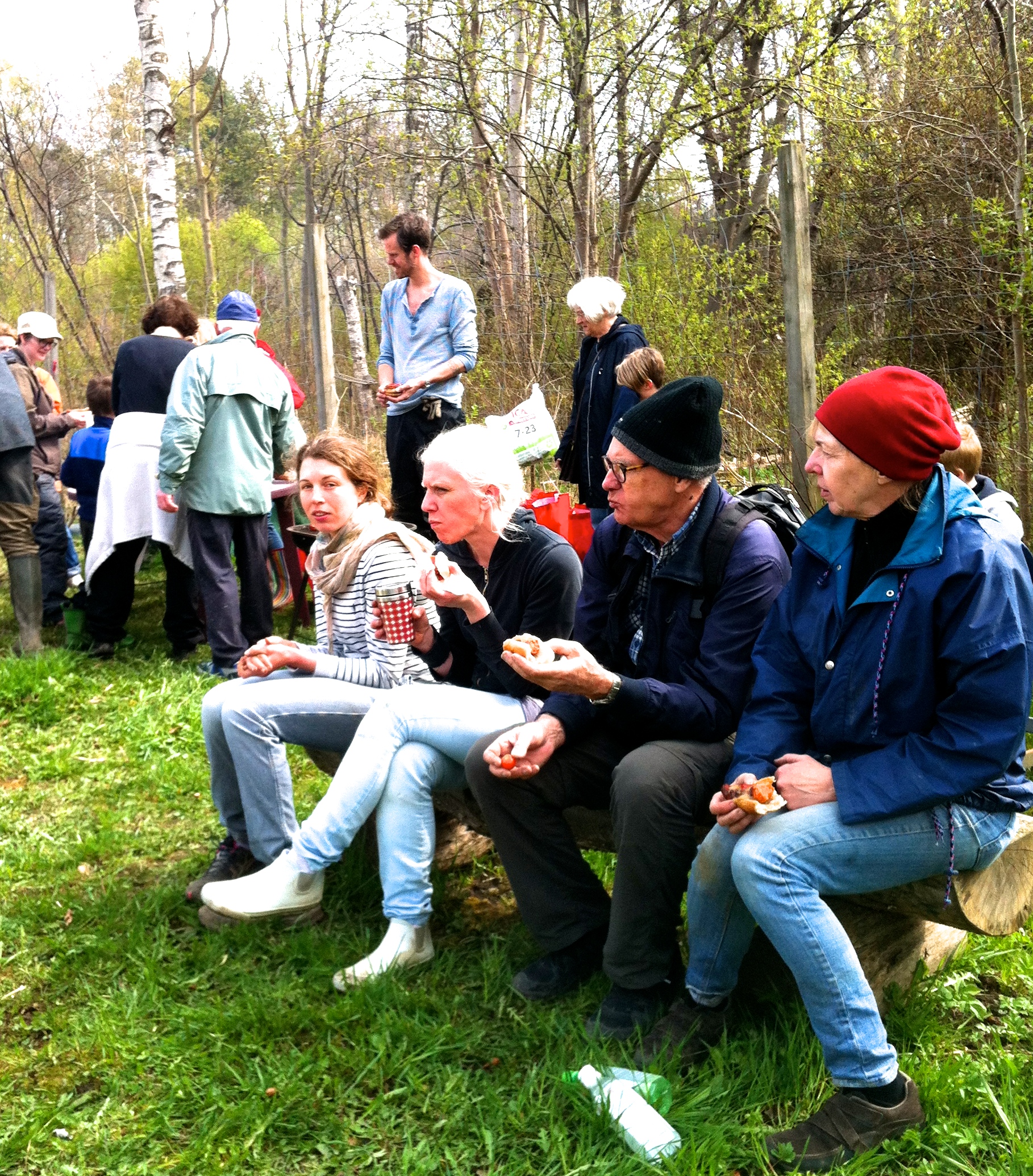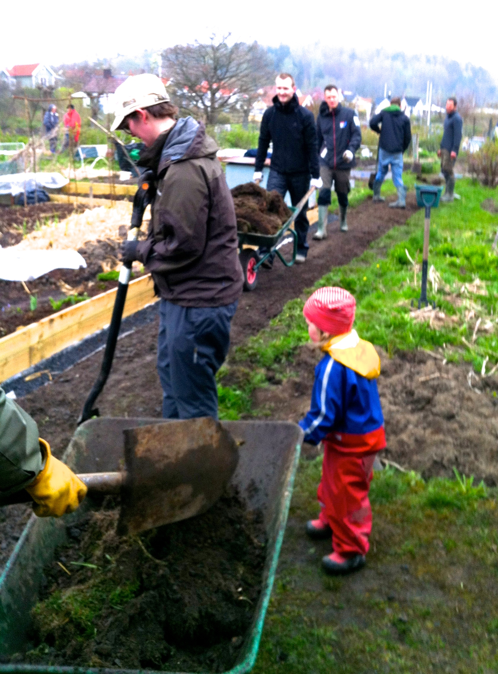 Alla jobbade på i regnet, men lagom till korvgrillningen tittade solen fram. Korv med bröd smakade bra och det blev en gemytlig samvaro med odlarkompisarna. Det har tillkommit en hel del nya och det finns fortfarande kö till lotterna. Åldersspannet är brett och det är roligt att både barn, unga och gamla kan ha trevligt tillsammans.