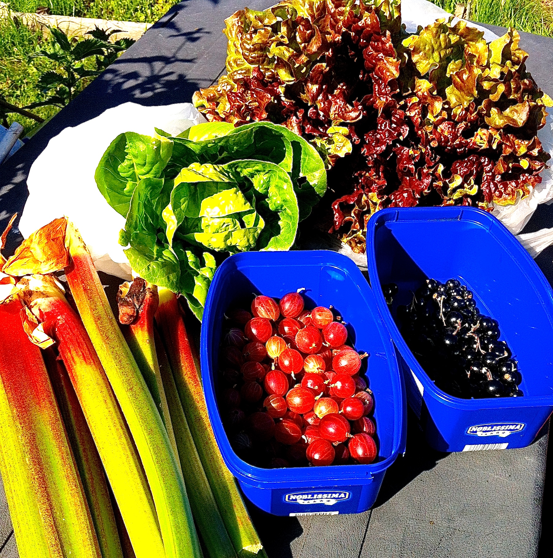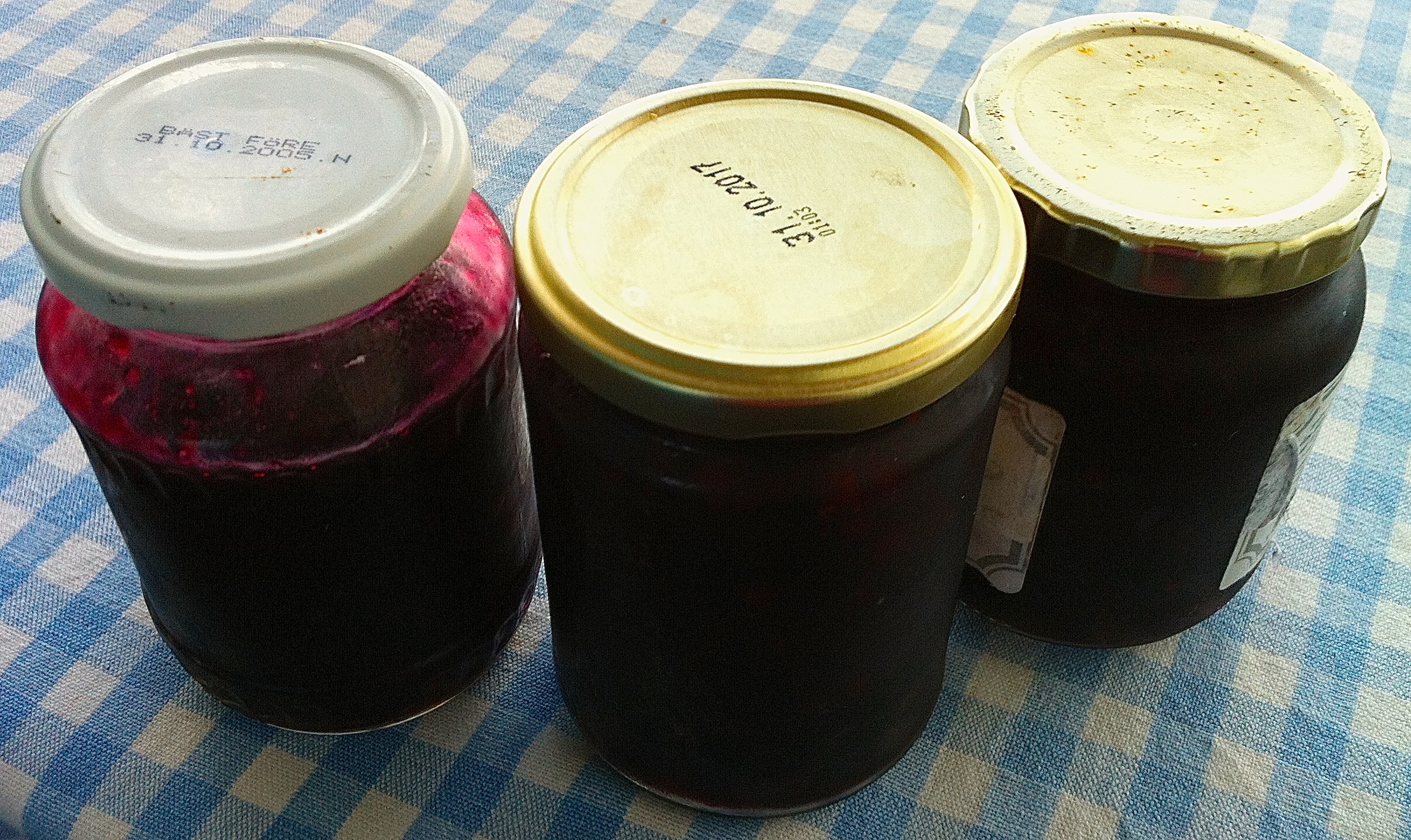 På söndagen när det regnade passade det bra att ta hand om den lilla skörden. Av vinbären kokade jag sylt, som jag kan ha till havregrynsgröten.