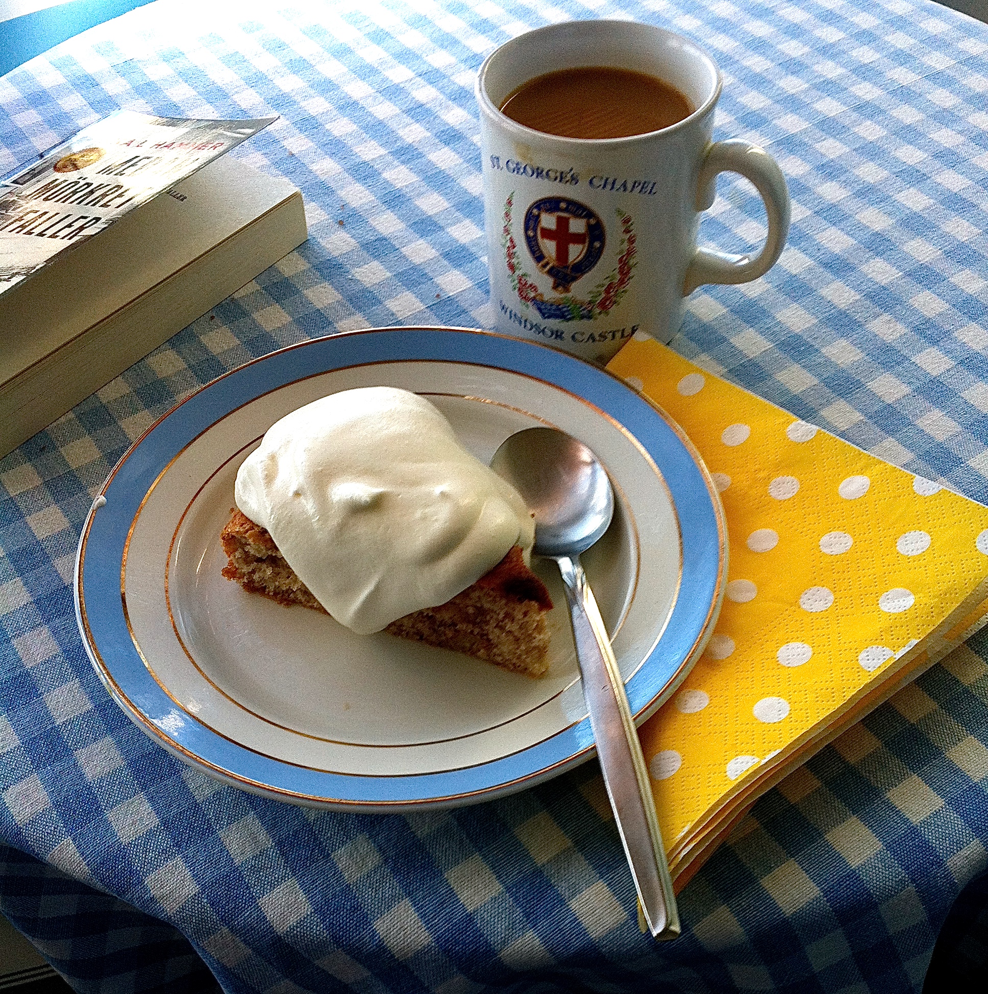 Några tunnare stjälkar blev rabarberkaka. Som smakade bra med lite grädde vid fika på balkongen medan regnet smattrade på rutorna (inglasad balkong!).