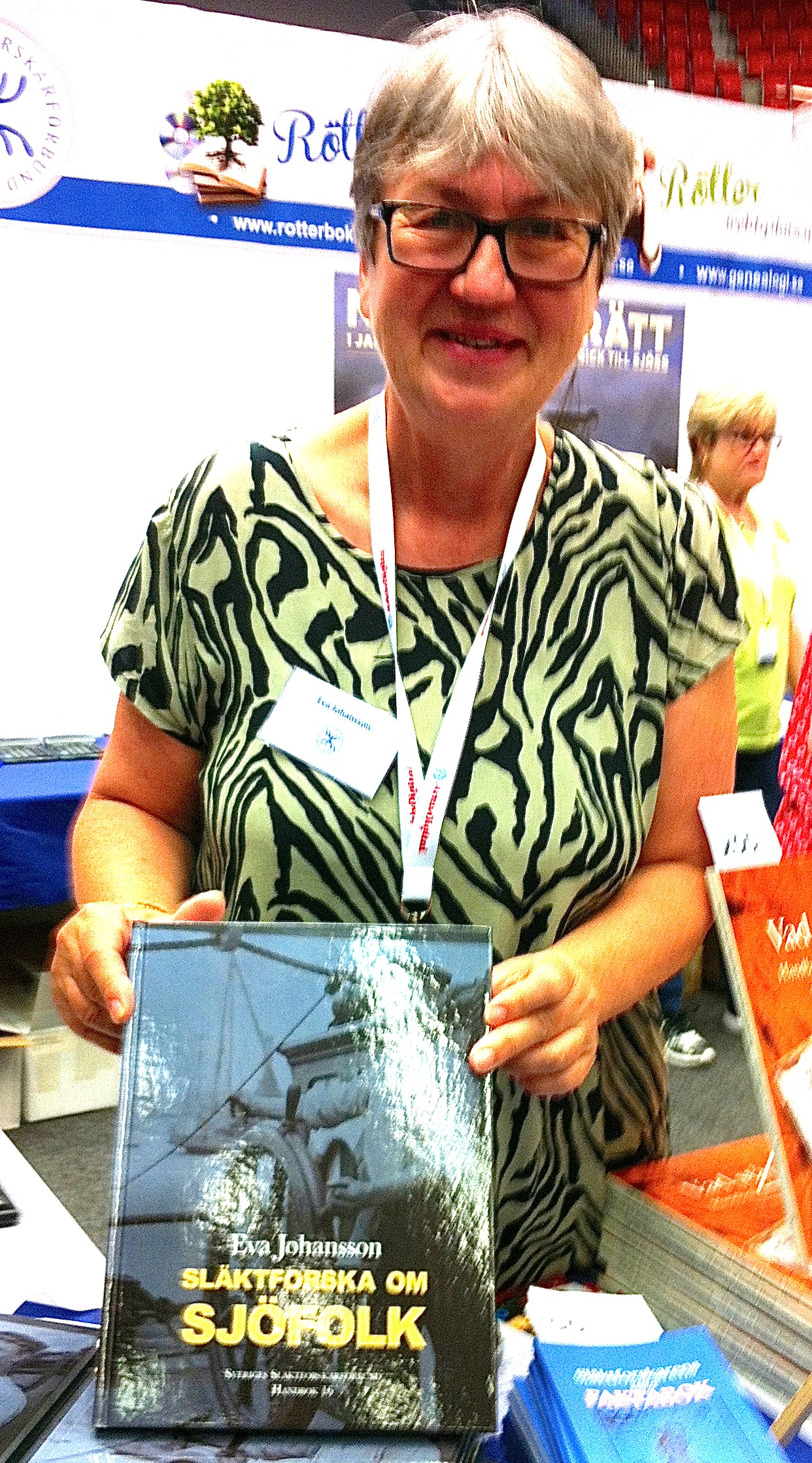 Jag besökte också Rötterbokhandelns monter, där släktforskaren och Rötter-bloggaren Eva Johansson sålde sin nyutkomna handbok ”Släktforska om sjöfolk”. Länk till Rötterbloggen  Min mormorsmor arbetade som kocka på ett segelfartyg i slutet av 1800-talet och jag har förgäves försökt få fram uppgifter om detta, men inte hittat något. Nu fick jag en förklaring. Kvinnor antecknades inte i sjömansrullorna! Jag får nu försöka forska vidare på annat sätt och fick lite tips av Eva. Länk till Evas hemsida Släktforskaren, där man kan få goda råd och hjälp med släktforskningen.