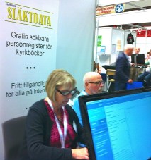 Lördag klockan 08.00 hade vi vår monter klar och klockan 09.00 släpptes besökarna in. Det var en jämn ström av intresserade släktforskare hela dagen, som var intresserade av hur man kan söka i Släktdatas register. Vi turades om i montern så att vi emellanåt kunde gå runt och besöka de andra utställarna eller höra på en föreläsning.